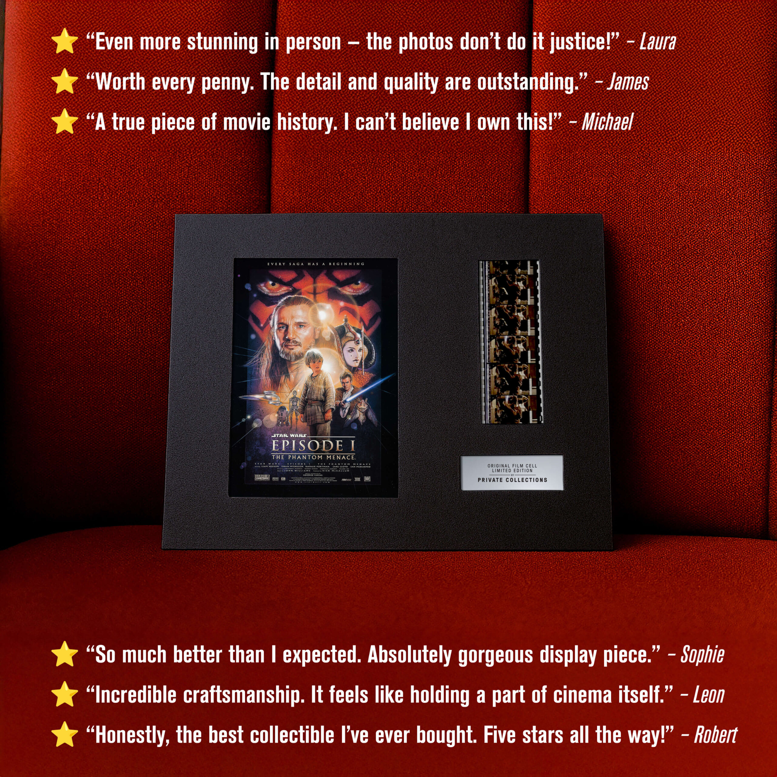 My jsme některé z nich zachránili ze soukromých sbírek a archivů — a dáváme jim nový život. Každý originální filmový pásek je ručně vybraný a pečlivě zarámovaný k vystavení. Není to jen sběratelský kousek. Je to skutečný artefakt filmové historie.